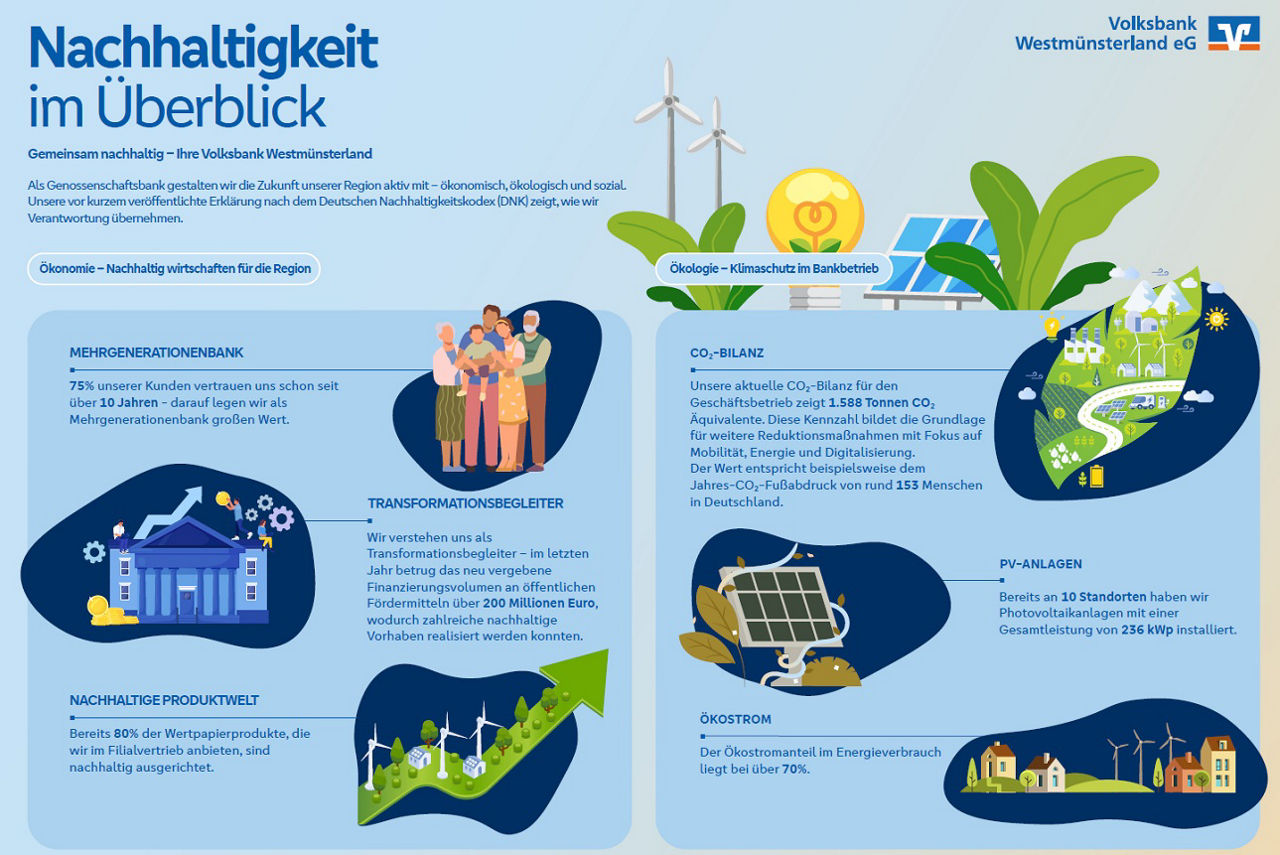 Mit unserer aktuellen kompakten Nachhaltigkeitsübersicht zeigen wir, wie wir als genossenschaftliche Regionalbank ökonomische Stärke, ökologische Verantwortung und soziales Engagement miteinander verbinden.